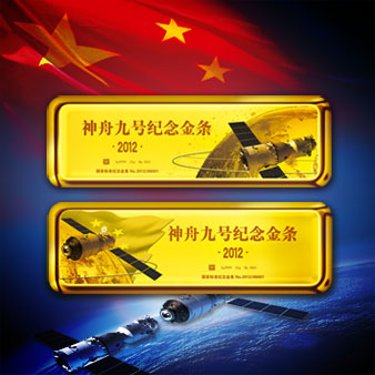 全套含2根25克Au9999金條,兩根金條正面分別精心雕鑄有神舟九號飛船與天宮一號環繞地球飛行的風采。特別要說明的是,兩根對接拼合在一起,寓意神舟九號與天宮一號成功對接,中國載人航天成功實現載人交會對接的新突破。兩根金條正面均鐫刻有“國家標準紀念金條”字樣和唯一編號,背面均鐫刻有“中國載人航天工程辦公室監制”字樣,全國僅限量發行2012套。