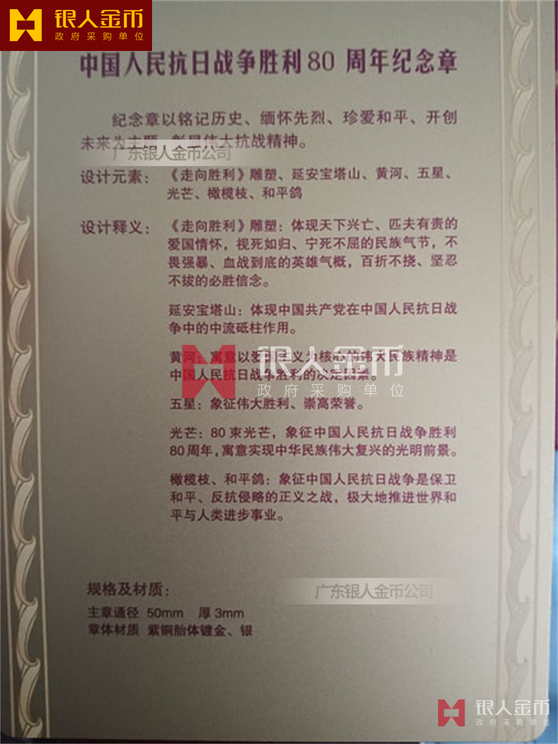 很抱歉,目前公開信息中未提及“中國人民抗日戰爭勝利80周年”紀念章的具體生產商。該紀念章由 中共中央 、 國務院 、 中央軍委 統一制作頒發,屬于國家層面的紀念品,其生產過程和供應商信息屬于保密范疇。 ?“中國人民抗日戰爭勝利80周年”紀念章生產商