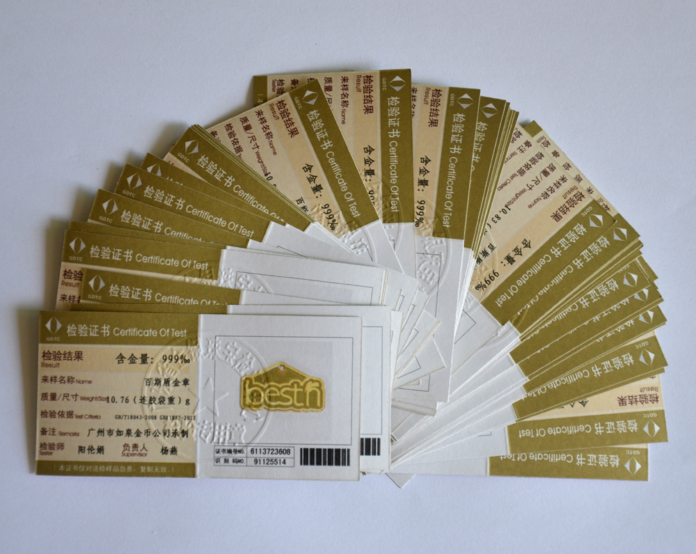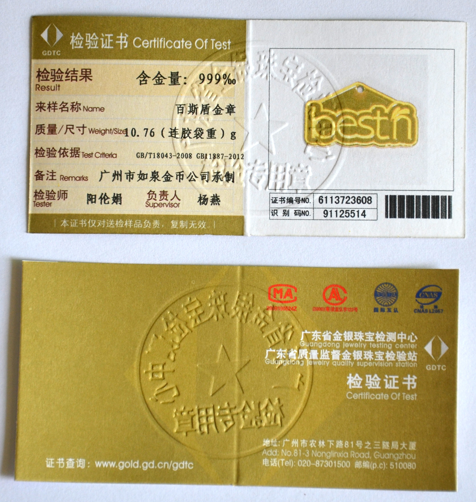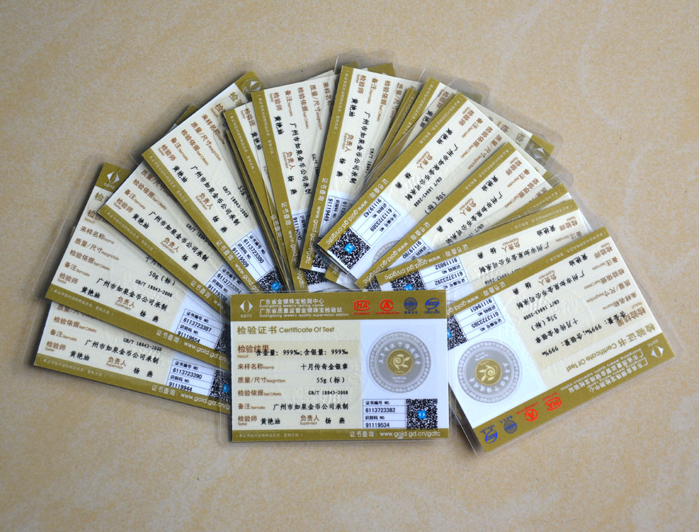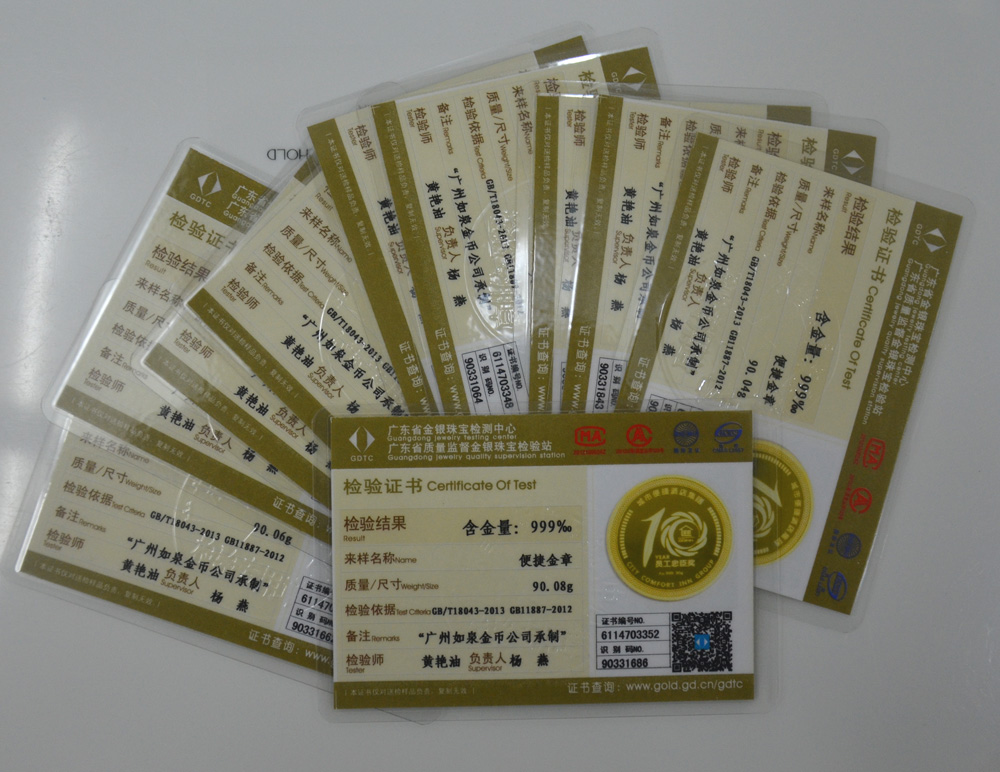 廣東省質(zhì)監(jiān)黃金千足金純金銀鑒定證書