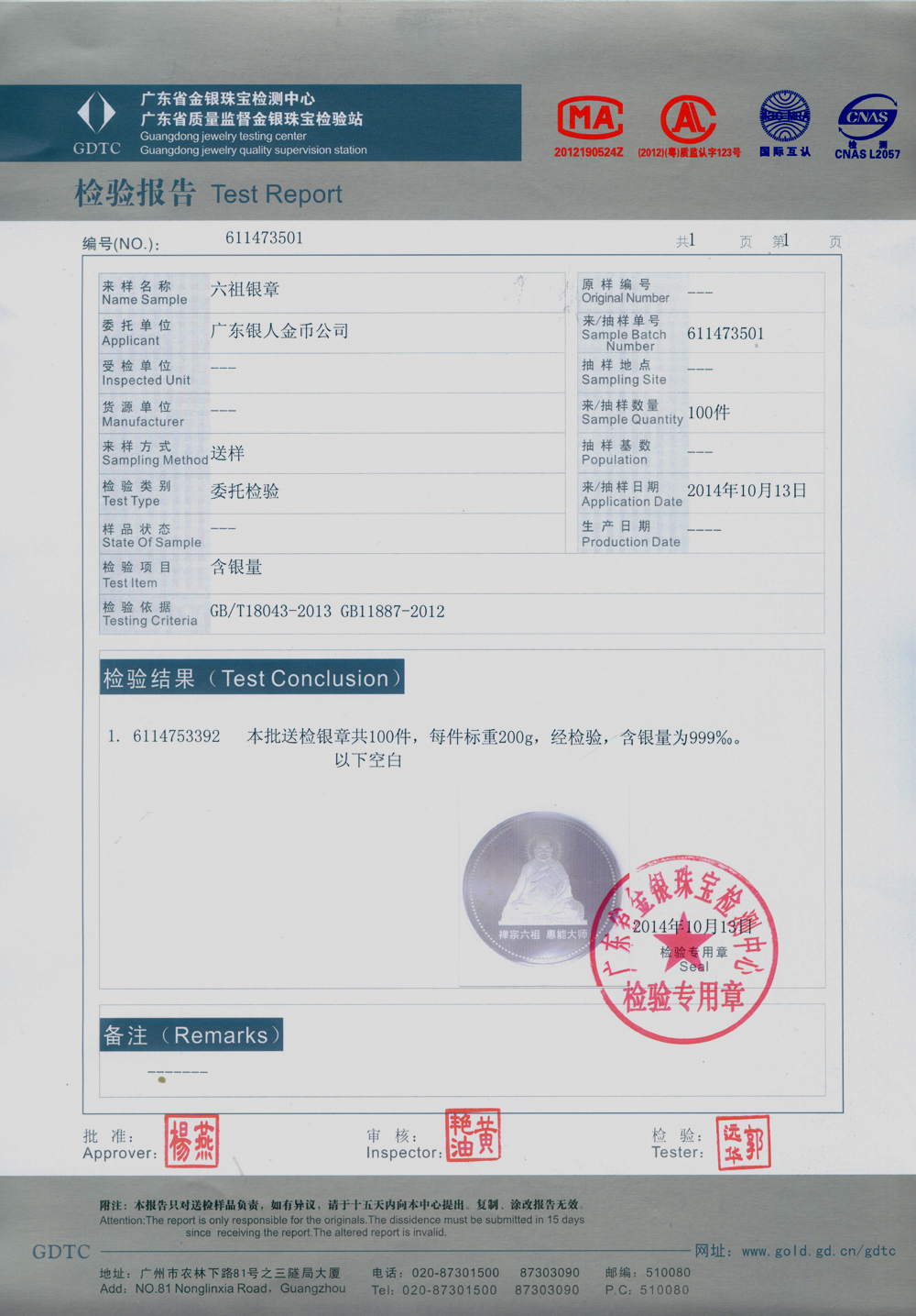 廣東省質(zhì)監(jiān)局白銀千足銀純銀檢測證書