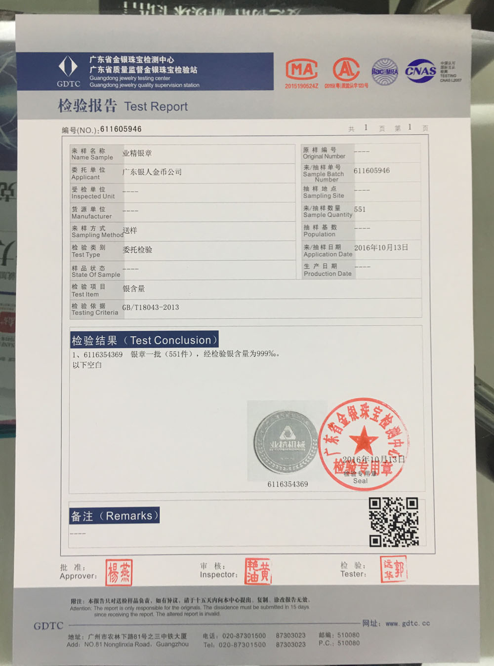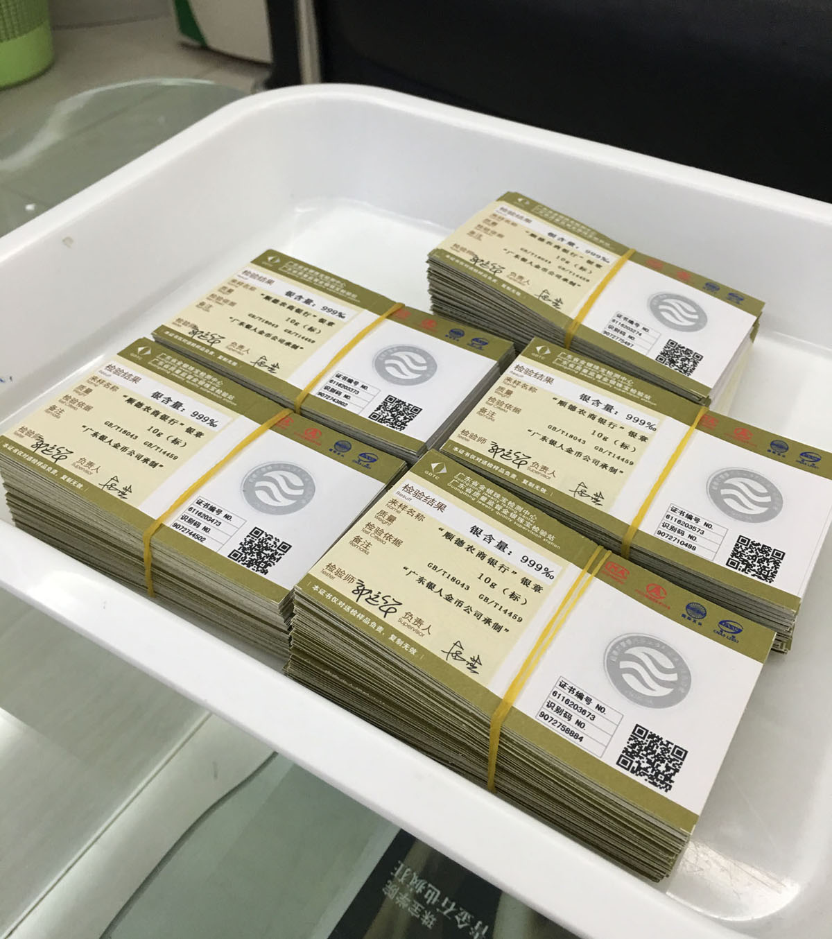 純銀銀牌含銀量國家權威機構檢測證書