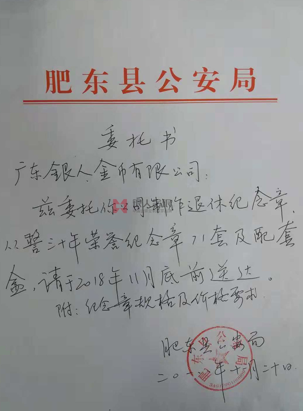 安徽省肥東縣公安局從警年限紀念章定制公函