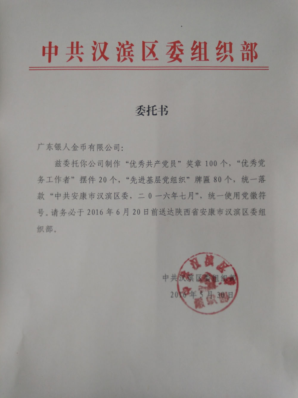中共漢濱區委組織部優秀共產黨員獎章定制公函