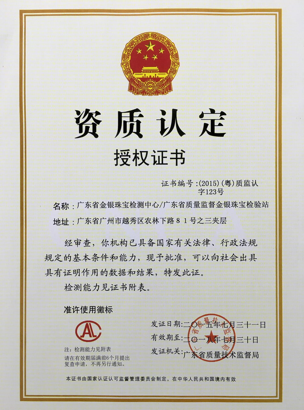 廣東省質(zhì)監(jiān)局頒發(fā)金銀資質(zhì)認定證書