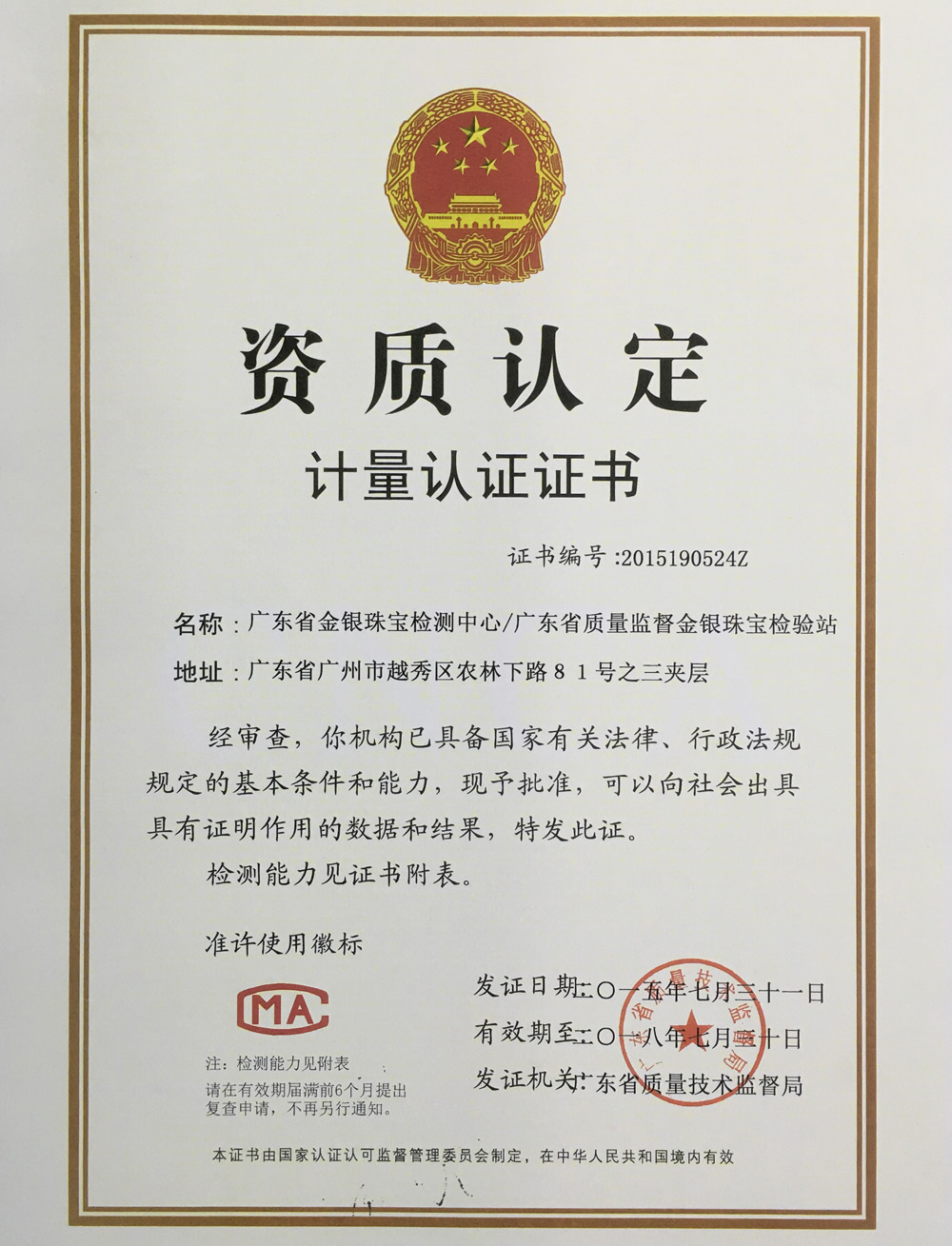 廣東省質(zhì)監(jiān)局頒發(fā)金銀計量資質(zhì)認定證書