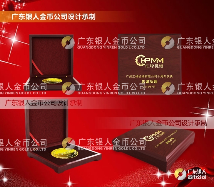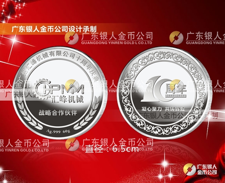 廣州匯峰機械公司成立十周年慶典紀念工作滿3年服務獎純銀紀念銀牌定制、滿5年忠誠獎純金銀獎牌定制、滿10年功勛獎純金銀紀念幣定制。