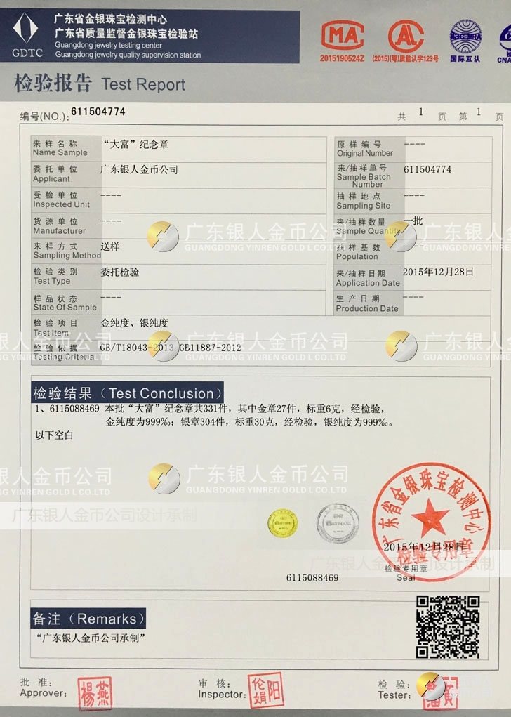 廣東銀人金幣公司承接客戶個性化定制的金銀幣、金銀章、金銀條、金銀牌、金銀盤均由國家質(zhì)監(jiān)部門、嚴(yán)格檢測、權(quán)威鑒定: