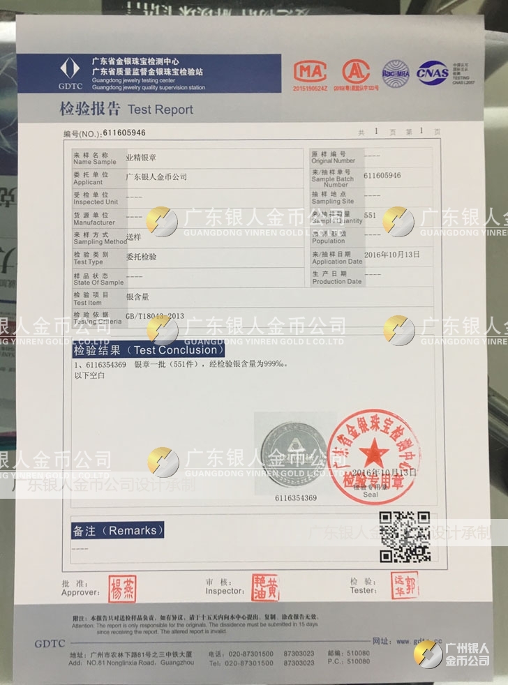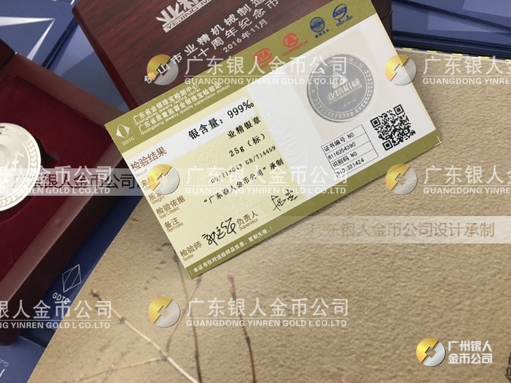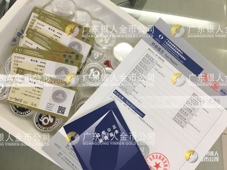 廣東銀人金幣公司承接客戶個(gè)性化定制的金銀幣、金銀章、金銀條、金銀牌、金銀盤均由國家質(zhì)監(jiān)部門、嚴(yán)格檢測(cè)、權(quán)威鑒定: